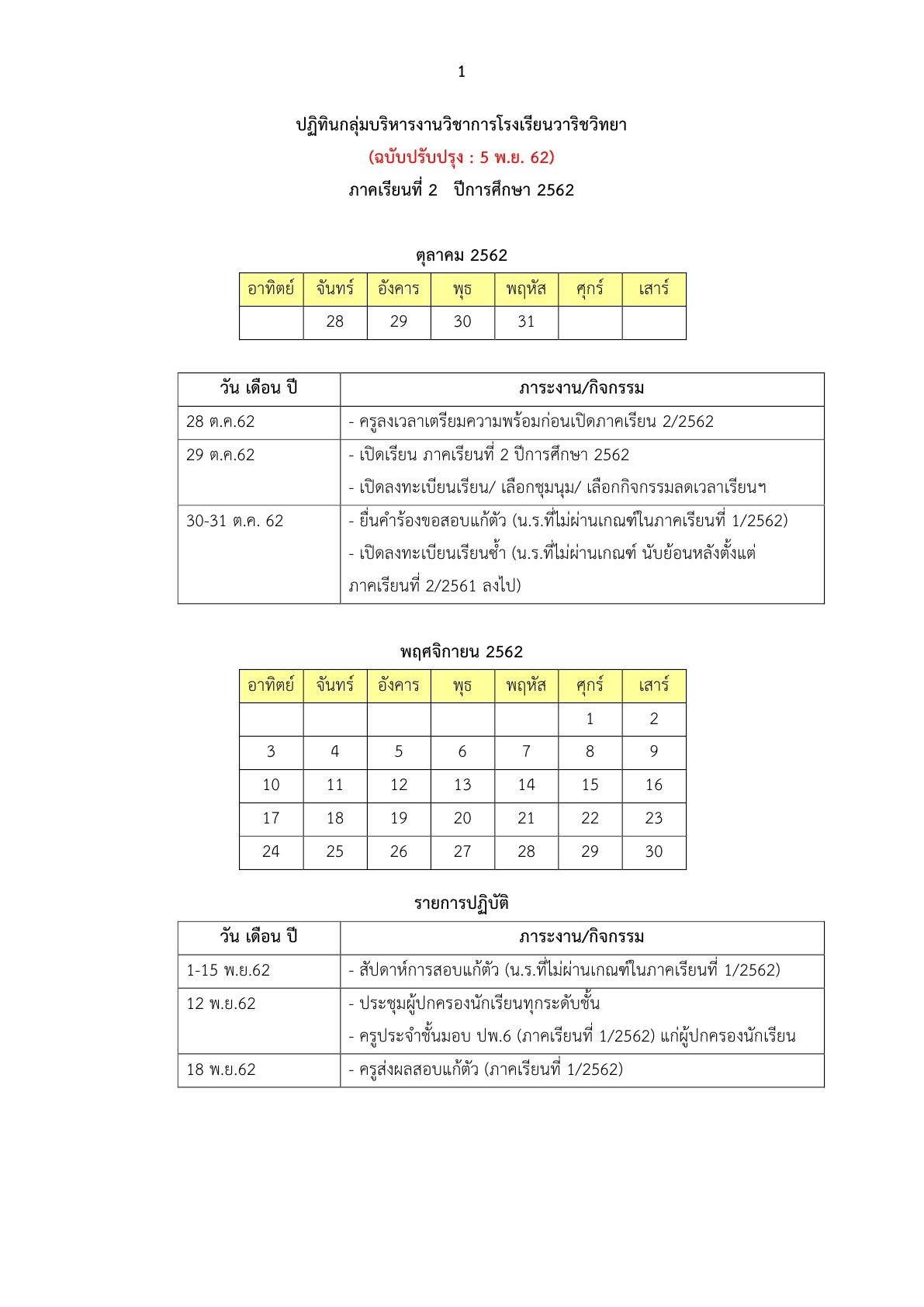 ประชาสัมพันธ์ ทางโรงเรียนวาริชวิทยา จึงแจ้งเปลี่ยนรูปแบบการ จัดการเรียนการสอนระหว่างวันที่ 12 – 16 กรกฎาคม 2564 และเปิดทำการจัดการเรียนการสอนตามปกติในวันที่ 19 กรกฎาคม 2564 จึงแจ้งประกาศดังนี้ 1. .ให้ข้าราชการครู และบุคลากรทางการศึกษามาปฏิบัติหน้าที่ตามปกติ เพื่อให้ครูจัดการเรียนการสอน ในรูปแบบ ดังนี้ 1.1 รูปแบบ Online จัดการเรียนการสอนผ่าน Google classroom,Zoom meeting,Line เป็นต้น 1.2 รูปแบบ On Demand เป็นการจัดการเรียนการสอนทางเดียว ผ่าน App DLTV,ผ่านเว็ปไซต์ DLTV.ac.th 1.3 รูปแบบ On hand เป็นการให้แบบฝึกหัดใบงาน ให้การบ้านไปท าที่บ้าน ซึ่งอาจใช้ร่วมกับการ จัดการเรียนการสอนรูปแบบอื่นๆ 2. ให้นักเรียนและผู้ปกครองติดตามข่าวสารของโรงเรียนของโรงเรียนวาริชวิทยา ผ่านทาง facebook ขอความร่วมมือผู้ปกครองทุกท่าน กำกับและดูแลนักเรียนในปกครองของท่านให้เข้าเรียนตามตาราง เรียนและช่องทางที่ครูประจำวิชาได้นัดหมายและให้ผู้ปฏิบัติตามาตรการป้องกันการแพร่ระบาดของโรคติดเชื้อไวรัสโค โรนา 2019 (COVID – 19) อย่างเคร่งครัด ทั้งนี้ ขอความร่วมมือผู้ปกครองทุกท่านได้ก ากับบุตรหลานให้เข้าเรียนตามช่องทางและรูปแบบที่ครู ประจ าวิชามอบหมาย จึงประกาศมาเพื่อทราบและโปรดให้ความร่วมมือโดยทั่วกัน ประกาศ ณ วันที่ 9 เดือนกรกฎาคม พ.ศ.2564