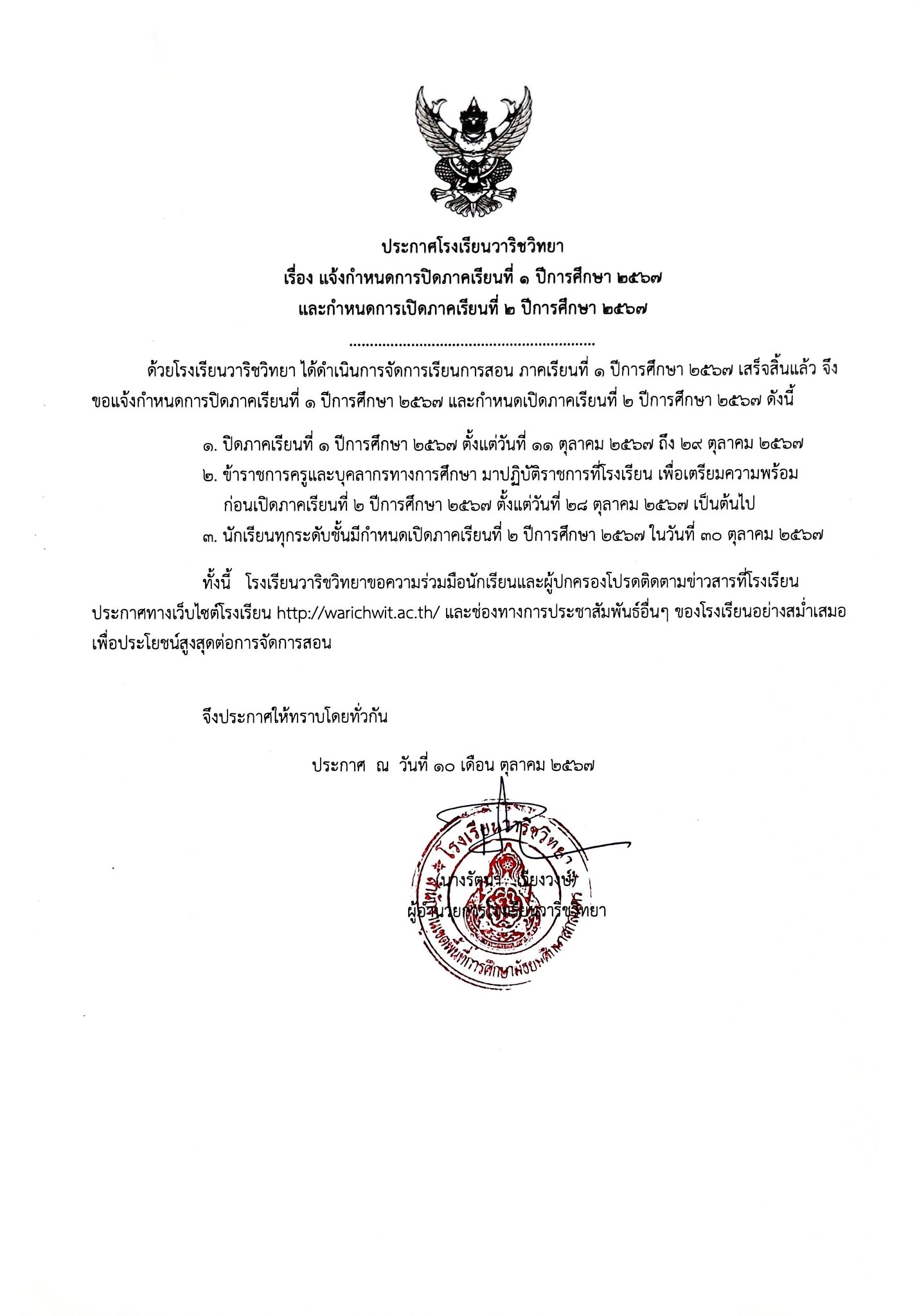 ประกาศโรงเรียนวาริชวิทยา เรื่อง เเจ้งกำหนดการปิดภาคเรียนที่ ๑ ปีการศึกษา ๒๕๖๗ และกำหนดการเปิดภาคเรียนที่ ๒ ปีการศึกษา ๒๕๖๗