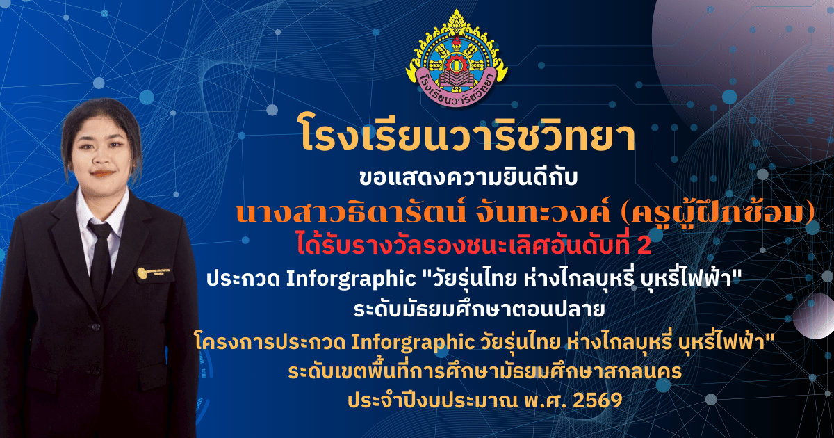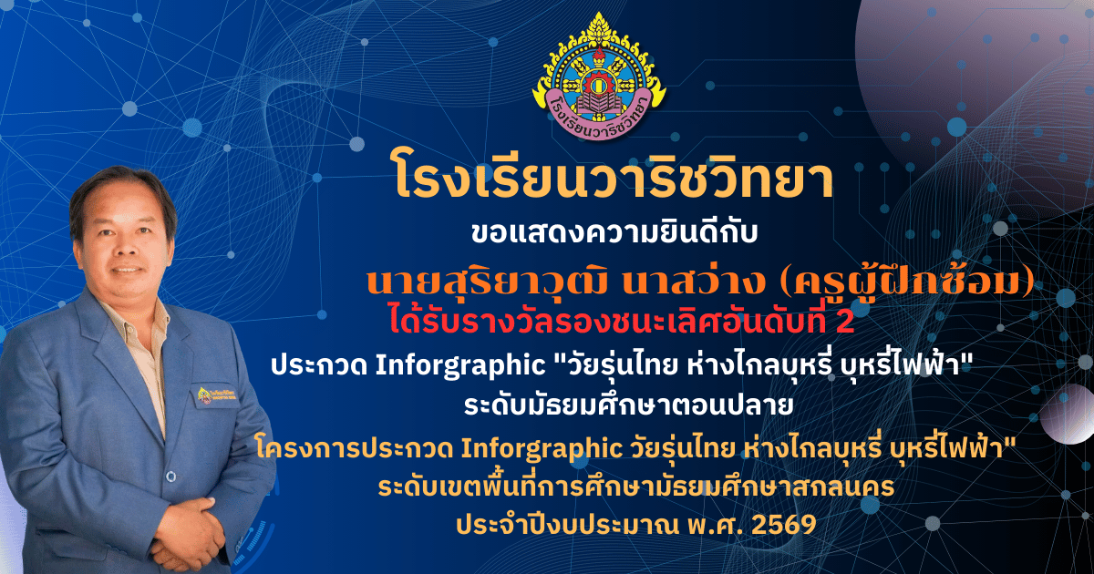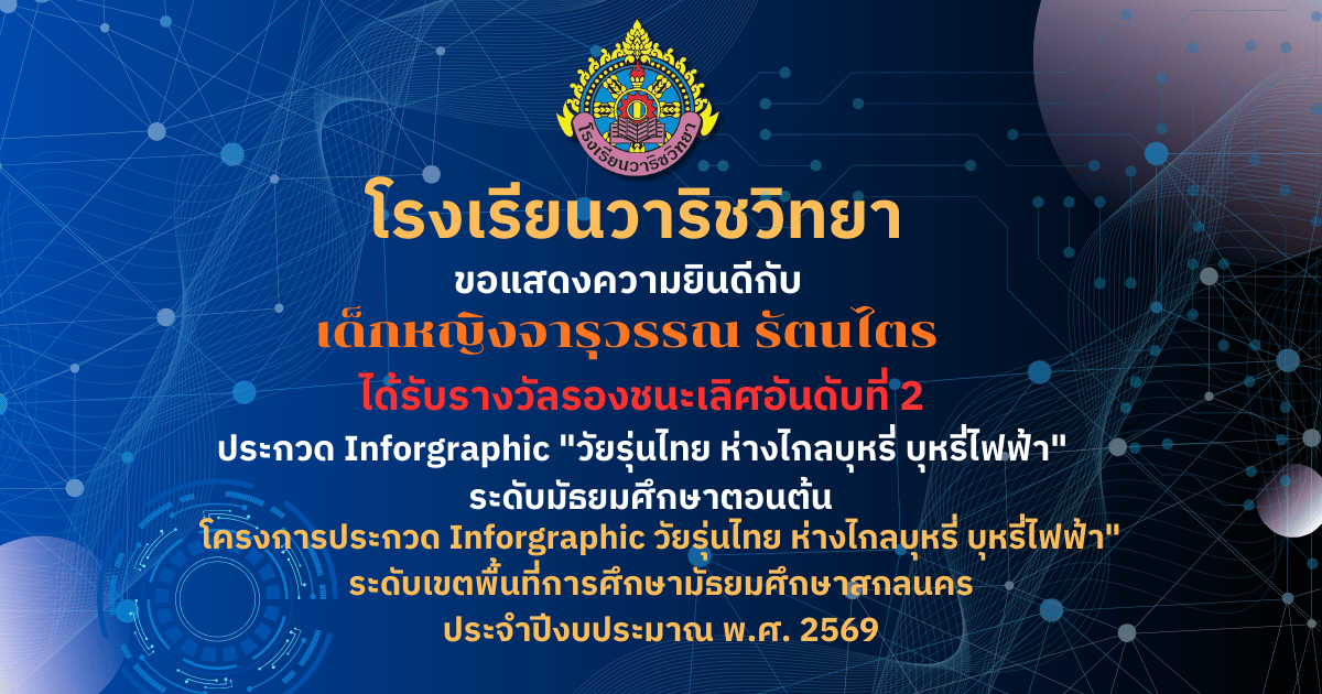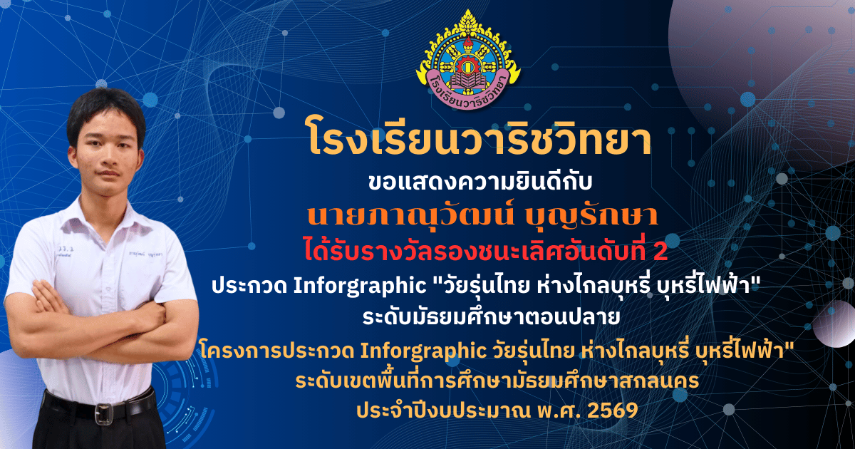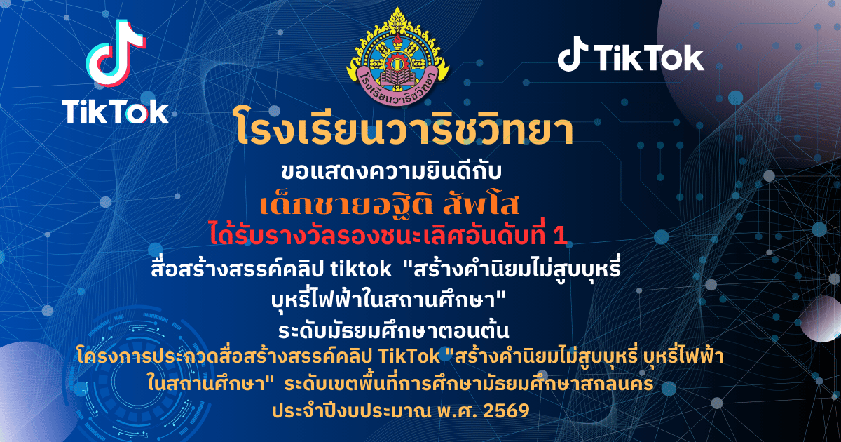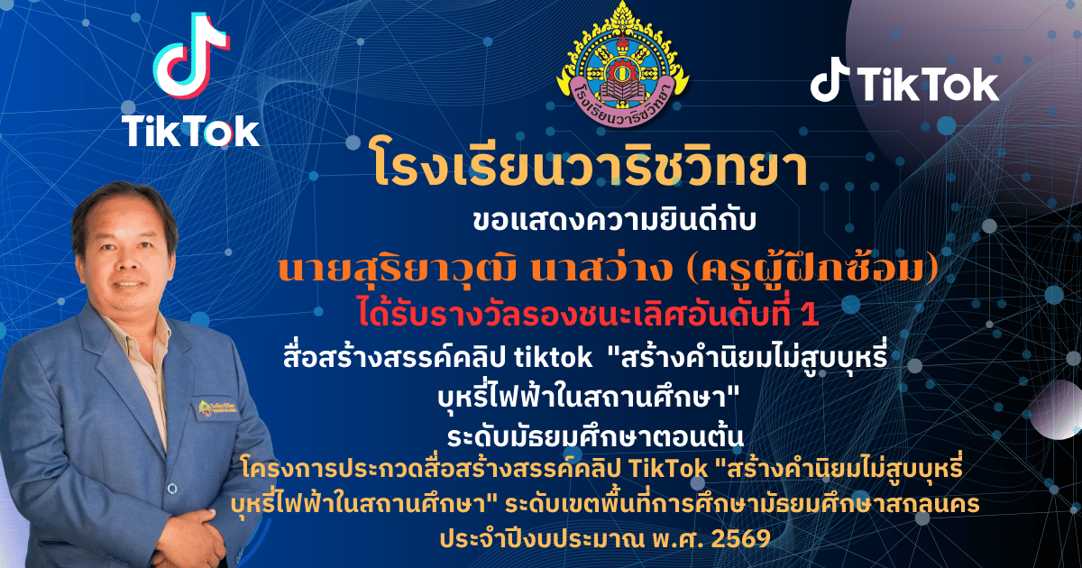 ขอแสดงความยินดี ? โรงเรียนวาริชวิทยา ขอแสดงความยินดีกับคณะครูผู้ควบคุมทีมและนักเรียน ที่สร้างชื่อเสียงให้กับโรงเรียน ด้วยการคว้า 3 รางวัล จากการประกวดสื่อสร้างสรรค์ ภายใต้หัวข้อ “สร้างค่านิยมไม่สูบบุหรี่และบุหรี่ไฟฟ้า” ได้แก่ ? รางวัลรองชนะเลิศอันดับที่ 1 18 มี.ค. 69