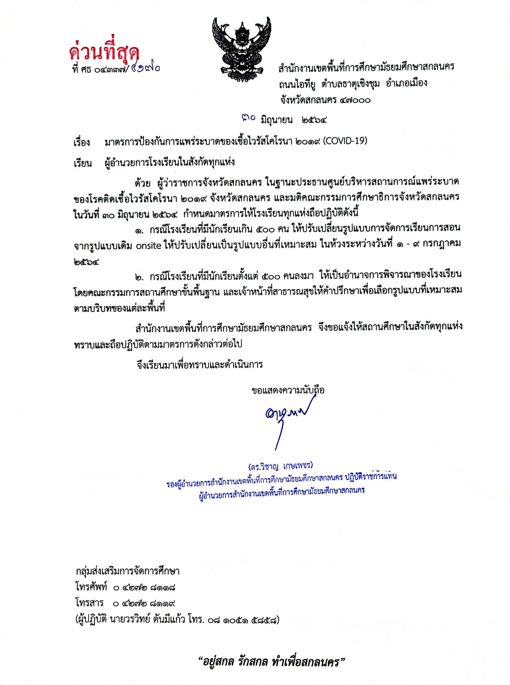 ประชาสัมพันธ์ ทางโรงเรียนวาริชวิทยา จึงแจ้งเปลี่ยนรูปแบบการ จัดการเรียนการสอนระหว่างวันที่ 12 – 16 กรกฎาคม 2564 และเปิดทำการจัดการเรียนการสอนตามปกติในวันที่ 19 กรกฎาคม 2564 จึงแจ้งประกาศดังนี้ 1. .ให้ข้าราชการครู และบุคลากรทางการศึกษามาปฏิบัติหน้าที่ตามปกติ เพื่อให้ครูจัดการเรียนการสอน ในรูปแบบ ดังนี้ 1.1 รูปแบบ Online จัดการเรียนการสอนผ่าน Google classroom,Zoom meeting,Line เป็นต้น 1.2 รูปแบบ On Demand เป็นการจัดการเรียนการสอนทางเดียว ผ่าน App DLTV,ผ่านเว็ปไซต์ DLTV.ac.th 1.3 รูปแบบ On hand เป็นการให้แบบฝึกหัดใบงาน ให้การบ้านไปท าที่บ้าน ซึ่งอาจใช้ร่วมกับการ จัดการเรียนการสอนรูปแบบอื่นๆ 2. ให้นักเรียนและผู้ปกครองติดตามข่าวสารของโรงเรียนของโรงเรียนวาริชวิทยา ผ่านทาง facebook ขอความร่วมมือผู้ปกครองทุกท่าน กำกับและดูแลนักเรียนในปกครองของท่านให้เข้าเรียนตามตาราง เรียนและช่องทางที่ครูประจำวิชาได้นัดหมายและให้ผู้ปฏิบัติตามาตรการป้องกันการแพร่ระบาดของโรคติดเชื้อไวรัสโค โรนา 2019 (COVID – 19) อย่างเคร่งครัด ทั้งนี้ ขอความร่วมมือผู้ปกครองทุกท่านได้ก ากับบุตรหลานให้เข้าเรียนตามช่องทางและรูปแบบที่ครู ประจ าวิชามอบหมาย จึงประกาศมาเพื่อทราบและโปรดให้ความร่วมมือโดยทั่วกัน ประกาศ ณ วันที่ 9 เดือนกรกฎาคม พ.ศ.2564